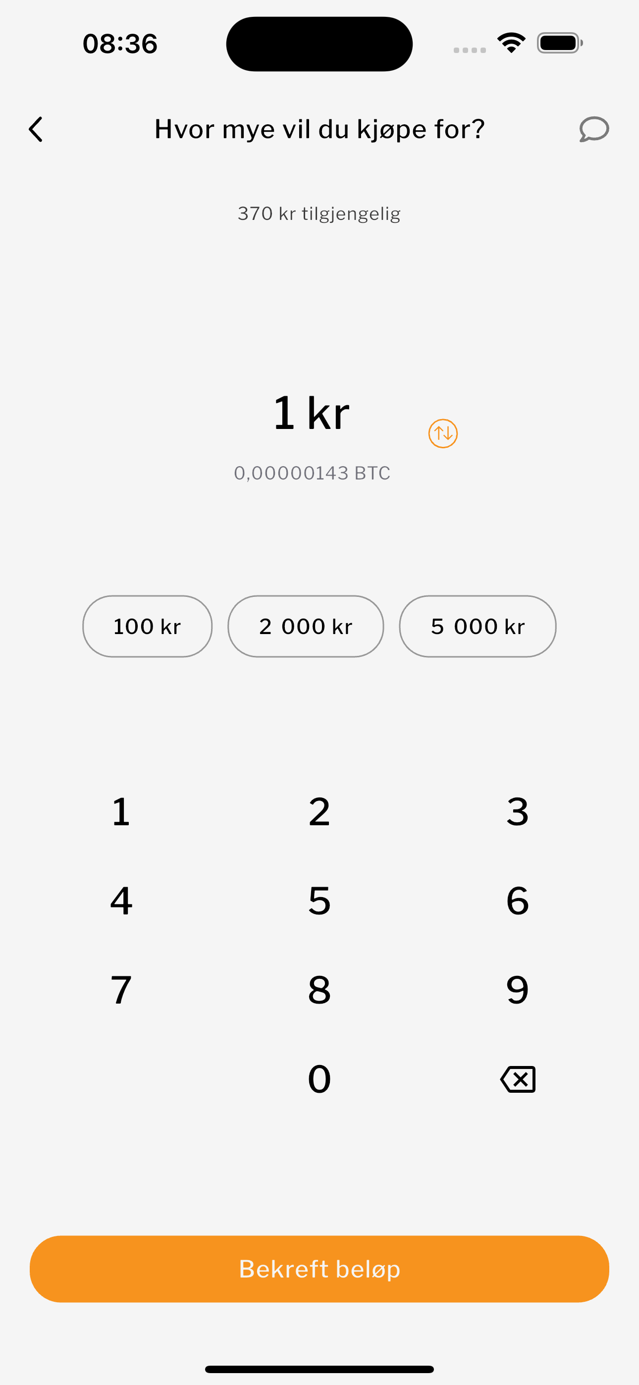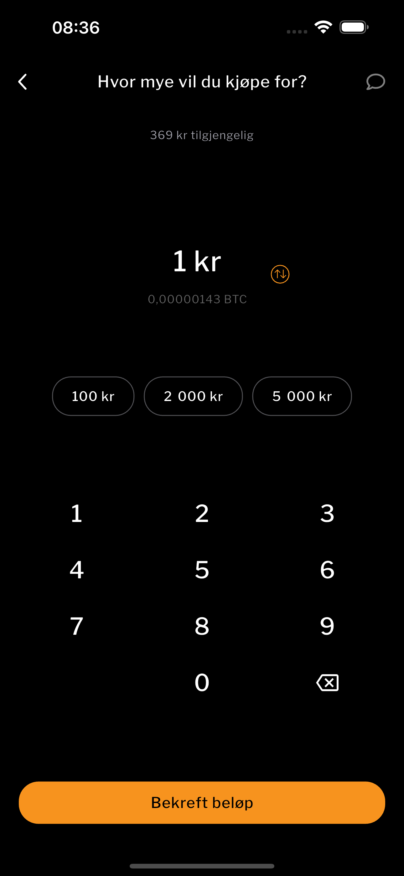 Velg hvor mye bitcoin du vil kjøpe. Start med så lite som 1 krone.